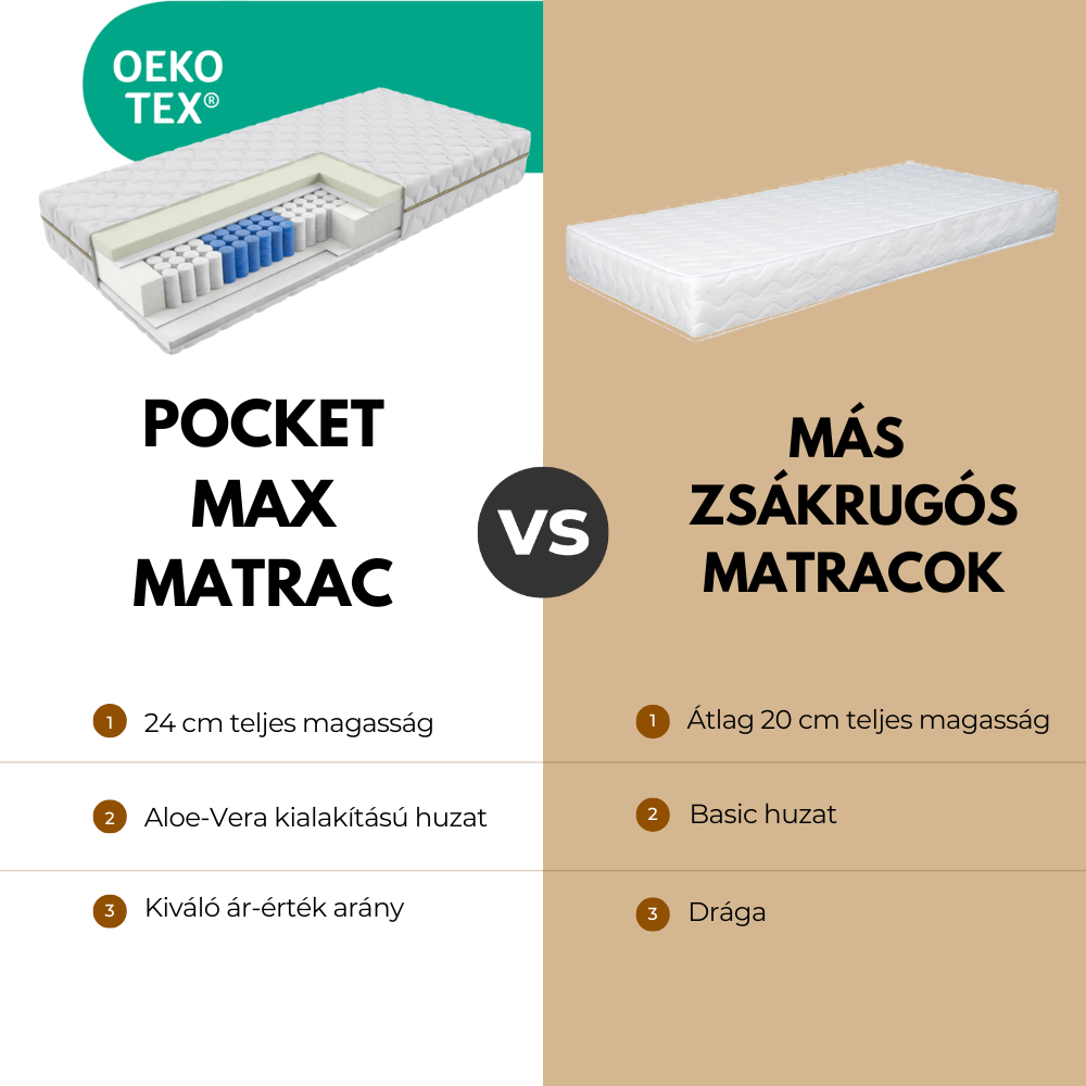 A Pocket Max matracot azoknak ajánljuk, akik egy félkemény, megbízható zsákrugós matracot keresnek kiemelkedő ár-érték arányban. Ideális választás mindazok számára, akik stabil alátámasztást szeretnének, ugyanakkor fontos számukra a kényelmes komfortérzet is. A matrac minden alvási pozícióhoz megfelelő, így háton, oldalt és hason alvók számára egyaránt kényelmes megoldást nyújt. Kifejezetten ajánlott azoknak, akik a vastag, masszív felépítésű matracokat részesítik előnyben, valamint hosszú távra keresnek tartós, megbízható alvásmegoldást kompromisszumok nélkül.