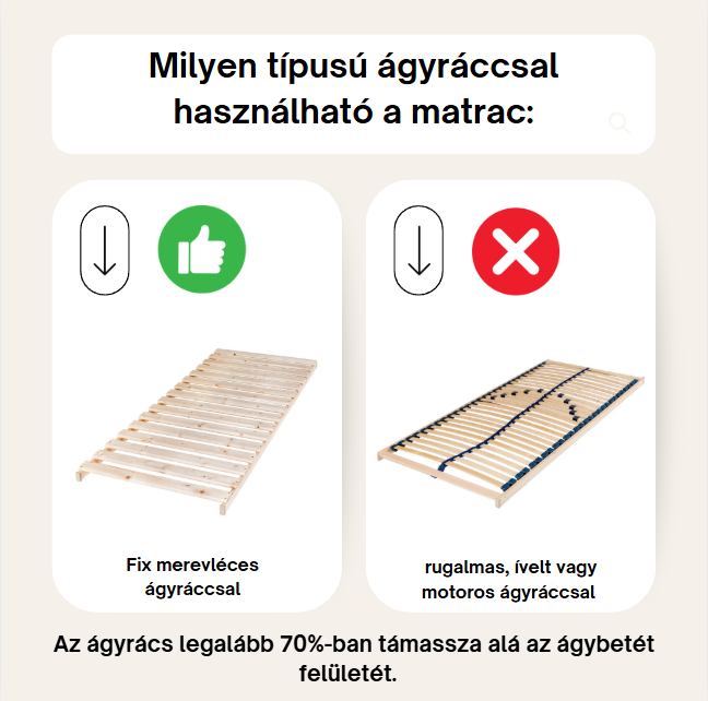 A Dream-Med Pocket Max matrac fix merevléces ágyrács típussal használható, ahol a ágyrács legalább 70%-ban fedi a fekvőfelületet. Abban az esetben, ha úgy ítéli meg, hogy a fogadófelület felületi kialakítása a matrac sérüléséhez vezethet, a deszkázat/lécezés, illetve a matractest között helyezzen el pl. egy átszellőzésre alkalmas takarót!